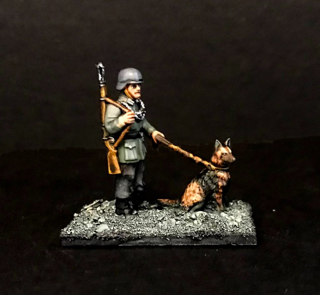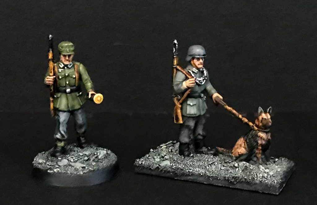 There are a few pieces that are fiddly and need more focus than choosing a pose and going for it. The feldgendarmerie gorgets that mark out the military police don't quite sit where you think they should, and I'm not super satisfied with where mine ended up. The other is the dog leads. The leads are to scale with the models, so they're slender and brittle, something that works much better in CAD design than translated to plastic. If you get them off the sprue and on the mini, fantastic, but I used greenstuff for one and a strip of plasticard for the other. I can imagine getting very frustrated with them if you're trying to keep them whole. As it was, they broke, I shrugged, and made replacements.