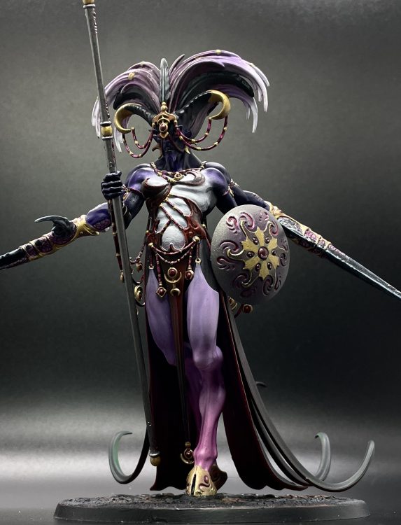 Up close, Shalaxi and Be’lakor are your bread and butter for this (plus a Bloodthirster if you have one). Shalaxi or a great axe Bloodthister have a pretty good shot at one-rounding a Knight (and will trivially stomp anything smaller), and Be’lakor isn’t far behind on that front. At range, your options are a bit more narrow, mostly coming from Tzeentch. The