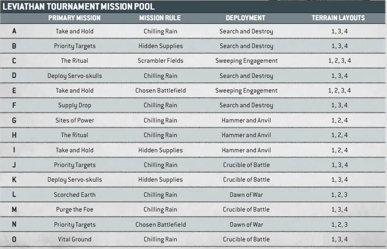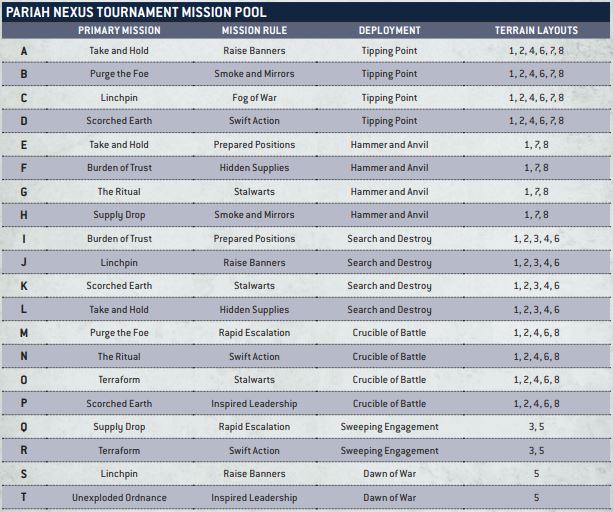Looking back at the missions of Leviathan is very interesting as we see a window into what eventually was polished in Nexus and Chapter Approved. We see a lot of the same missions we have now, just slightly worse. Remember when you could get kill more turn one on Purge the Foe? I do, and it was not any fun. We also have Servo Skulls and old Ritual, two missions that were both disasters in their own right, along with Vital Ground, Priority Targets and Sites of Power, three missions found in Leviathan that do not return in future packs. Honestly all of these were unpleasant for different reasons. Vital Ground removing the center was probably the least offensive but still was not great, throwing off the balance of fighting for the middle that players are so used to. Priority Targets was a real stinker, super swinging the game to the player going second, with effectively 30 points in differential up for grabs at the end of the game. Sites of Power was perfectly fine for any army with multiple characters, but there were plenty and still are plenty examples of armies who just run one or two characters who this mission is terrible for. In general it is better for the game to keep missions as army-agonistic as possible; giving a mission to an army that only has one or two good characters and saying “tough luck” really is not what we want to be doing for a healthy game.