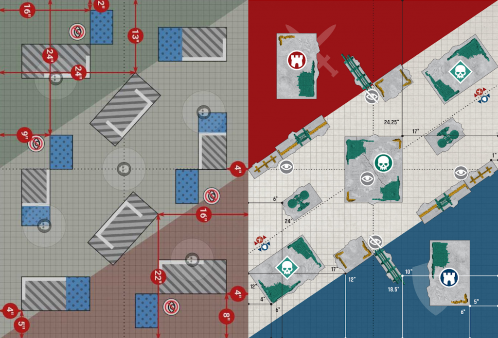 feel less busy in terms of its terrain, and in fact has a reduction in firing lanes, given those thinner 'line' Terrain Areas are also Obscuring. This is due in part to the fact that, between the two new 11th layouts we've seen, the backfields have a lot more room. This should make for less clustered deployments, and that means potentially fewer opportunities for jailing lists to operate effectively. Later on in the game, this could also mean Deep Strikes are harder to screen, as parking a squad in the central line of deployment exposes you to a nasty cross-map firing lane...so be sure to give them Hidden, if you can. Another reason this seems similarly thick with terrain comes down to the footprints having crenelations, and little jut-outs that attempt to reduce the concerns with all of 10th's L-shaped terrain. I think that hate was overblown, mind you, but the push for a thematic map means strict squares no longer do. Another change is down to the color of each Terrain Feature—Yellow means go, paradoxically, for Vehicles & Monsters to move over, while Teal is similar to 10th's Ruins, passable only by smaller units. The last thing I want to call out is some of the wacky measurement. 24.25"? 18.5"? The best reason I can surmise for why these hard-to-remember numbers were chosen comes down to the fact that the central ruin mimics A4 paper size, with room for bleed, at exactly 8.5"x11". From a printing perspective, it probably made some sense, but leaves us in an odd spot that likely needs some touching-up from a Tournament Companion somewhere down the line.