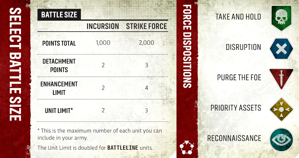 Detachments are even more important to an army's playstyle than before, and that comes from each providing access to one (or more?) Force Disposition(s). These represent the mission or strategy your army is undertaking in a given battle, and will radically alter the course of play thanks to it affecting your Primary Mission. Before the game begins, you compare your Disposition with your opponent, and follow a handy dandy flowchart to figure out each players' Primary Mission, based on their opponent's Disposition. Ad you can surmise, this means that unless both players have the same Disposition, each player is scoring a different Primary Mission during the course of a game, which is a *wild* concept. For matched play, every force locks their Force Disposition in at list building, meaning you know the five possible Primary Missions available to you before attending a tournament. This helps a ton both in terms of pre-planning, given savvy players can know the specific measurements and gameplan for their missions, and is significantly easier on organizers in selecting their mission packs...given the game selects for you. From a conceptual standpoint, I'm all for this, but as mentioned in the article some highly lethal forces can focus less on actions & objectives, and more on killing. Coming out of C'tan Winter, that's just a bit spooky, and statcheck armies likely see massive upside from choosing a lethality-driven Disposition.