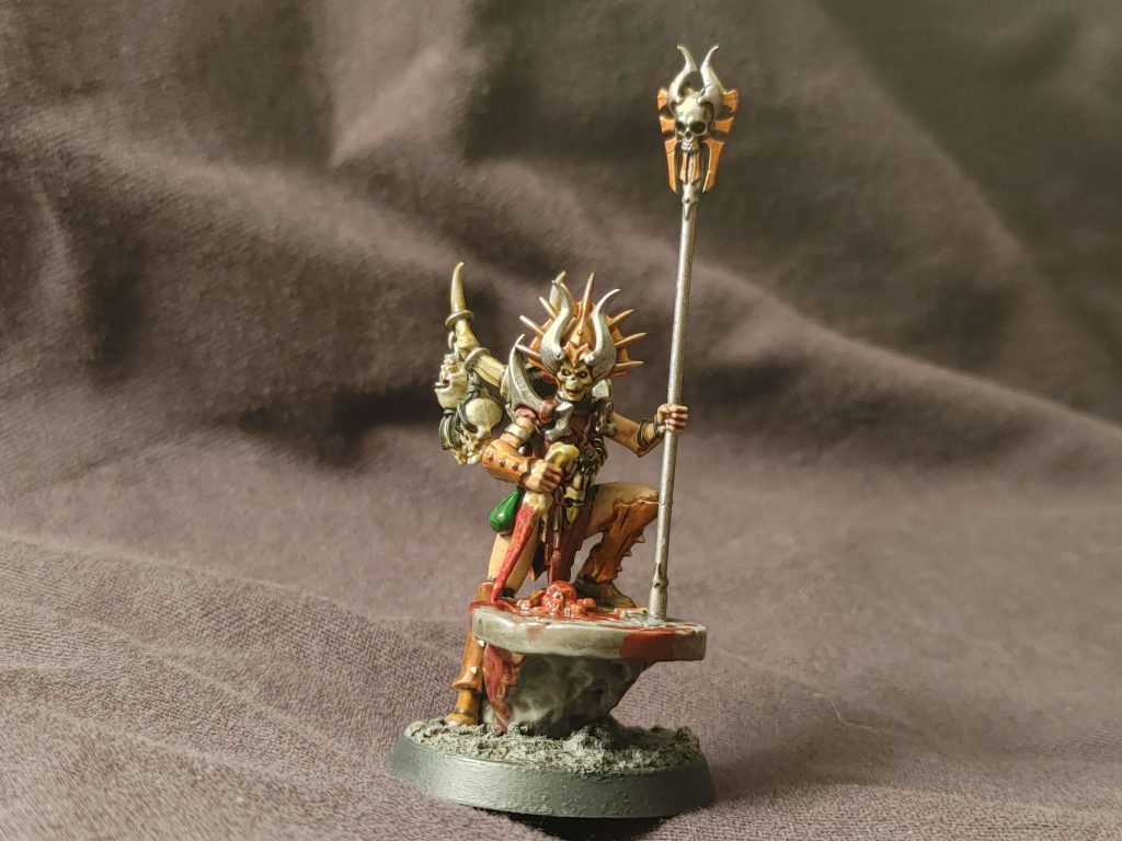 The mounted version of the above, he has a lot in common with the Skullmaster. He also grants Reroll charges once per game on his own mounted friends, the Skullcrushers. Also gets the flat 3 mortals on a 2+ when charging but is notable for just how damn tanky he is. A