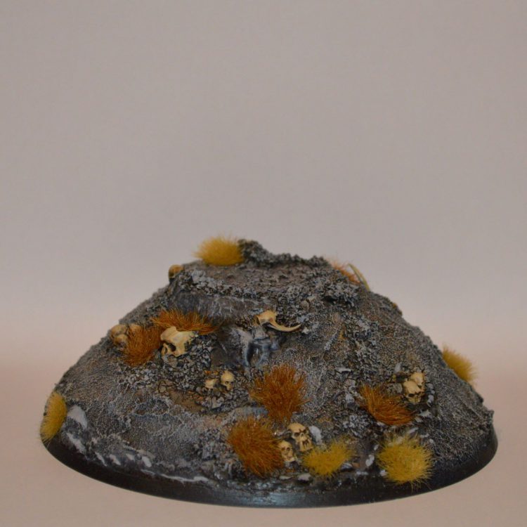 Bafflingly, despite his size GW have officially recommended a base size of 130mm Round, instead of the much more reasonable 40mm square that he comes bundled with, as such I had to create a large hill base on which to mount him. I constructed this with stacked layers of foamboard, smoothed over with a little bit of all purpose filler. Once this was done I added some sand, cork rocks, skulls and texture paints before painting it and adding tufts.