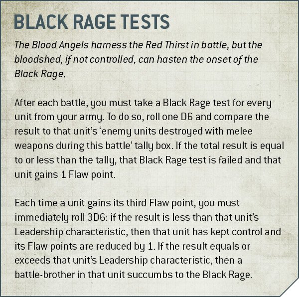 This replaces the standard Matched Play method of having units succumb to the Black Rage via Stratagem and the rules for this give you a way to handle losing Characters - including Captains and Lieutenants - and Dreadnoughts to the Black Rage, as well as losing individual models (units basically take a Devastating Blow since they effectively lose a member permanently). Death Company marine and Intercessor units don’t gain experience points but they automatically passOut of Action tests and never gain Battle Scars. Instead each time you lose models in other squads to the Black Rage you can give one of these units 2 Battle Traits for a single game.