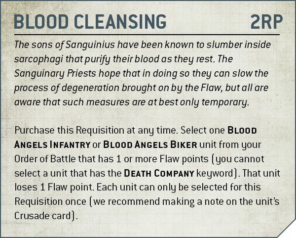 The Blood Angels requisitions revolve around the Death Company and Black Rage mechanics. Descent into Madness replaces the rules for adding a Captain or Lieutenant to the Death Company (The Lost) in Crusade, instead letting you spend 1 RP to convert a Captain or Lieutenant to a Death Company variant. Custodian of the Lost upgrades a Chaplain to let him help your units keep the Black Rage in check, allowing you to re-roll a single failed Black Rage test after each battle. Noble Heritage upgrades a unit to gain an additional Battle Trait once it hits 71+ XP, and Blood Cleansing lets you spend RP to reduce the number of Flaw points a unit has.