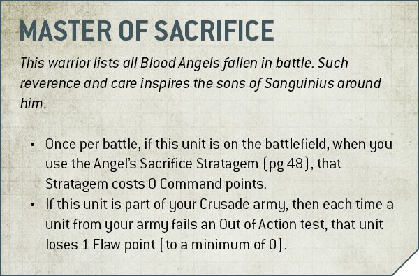 Descent Into Madness is welcome here, and Blood Cleansing is a good interaction with the Flaw though it potentially hurts Blood Angels by giving them something to spend RP on that isn’t unit upgrades and is potentially all downside. You avoid taking a Devastating Blow on a key unit, but it’s also something that other chapters don’t have to worry about.