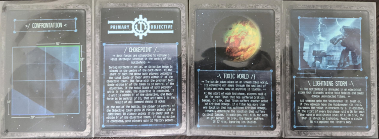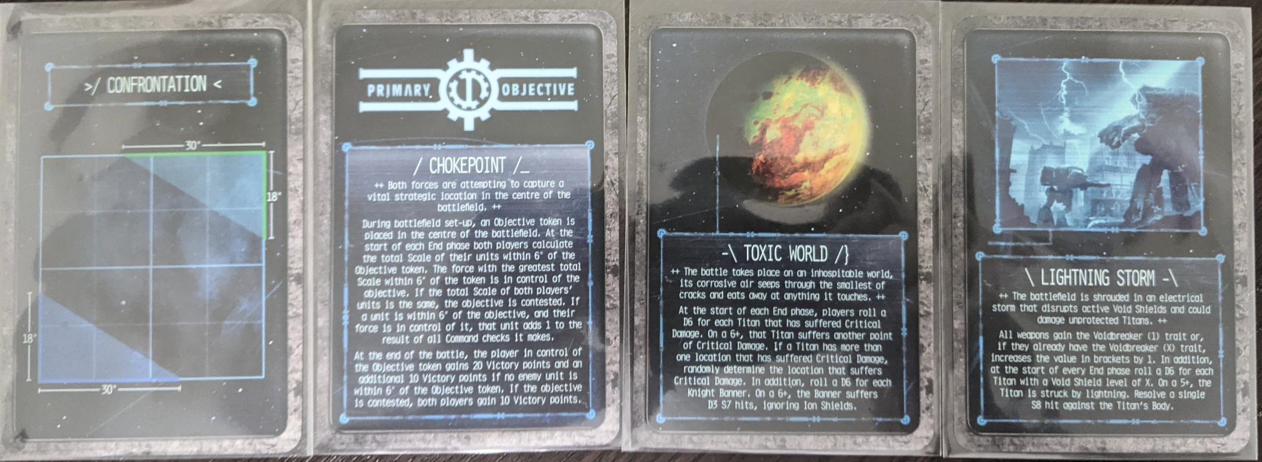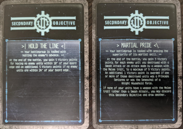 We’ve been loving using the Open Engine War deck of cards for our games, using the draw 3 strike 1 each method we discussed in our review of the card deck. Bair had the Hold the Line Secondary while Condit took Martial Pride. Here’s the mission we wound up with: