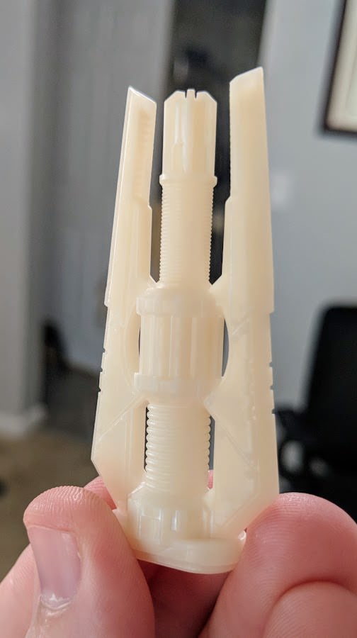 Those "rivets" on the size are roughly half a millimeter in diameter, and you can barely tell the difference between the printed gun and the injection molded base behind it. I was able to print this part after less than a week of working with the Photon. My biggest challenges were balancing details and the limitations of the printer, dialing in the settings to ensure a quality build, and tweaking the geometry so that it looked right.