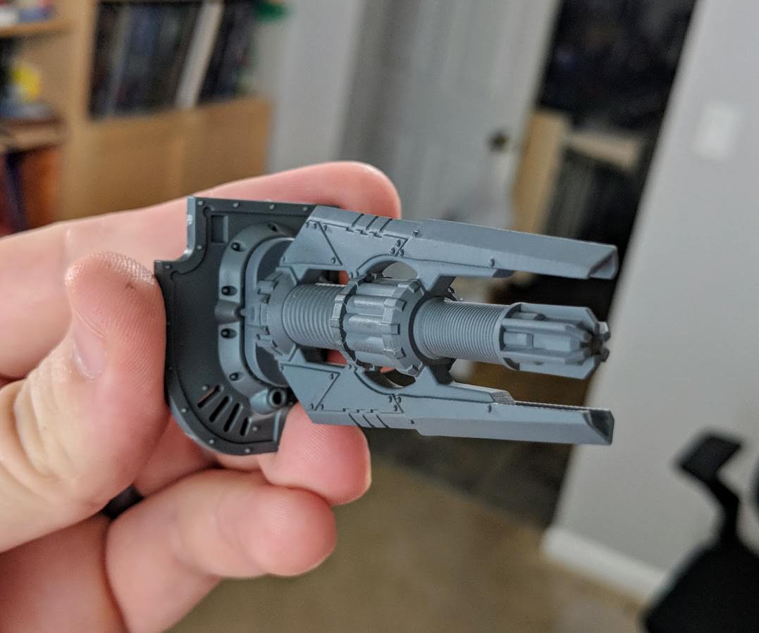 Above is an example of the kind of quality you can get from a 3D printed part using SLA. When the 8th edition Codex:Imperial Knights first came out I wanted to build a then-new Knight Preceptor, but GW wouldn't release the model until after NOVA 2018. Rather than wait, I took advantage of some CAD software I was familiar with and put together my own las-impulsor. After three iterations I was able to successfully make the part, and with a bit of sanding and priming the end result turned out great.