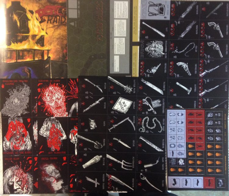 Psycho Raiders doesn't come in a box. It's a magazine that comes with some cardstock cards and counters that you'll have to cut out yourself before play. The hand-drawn colored pencil style art pulls you into the game immediately, with graphic descriptions of all the ways your characters might come to a bloody end. At its core,