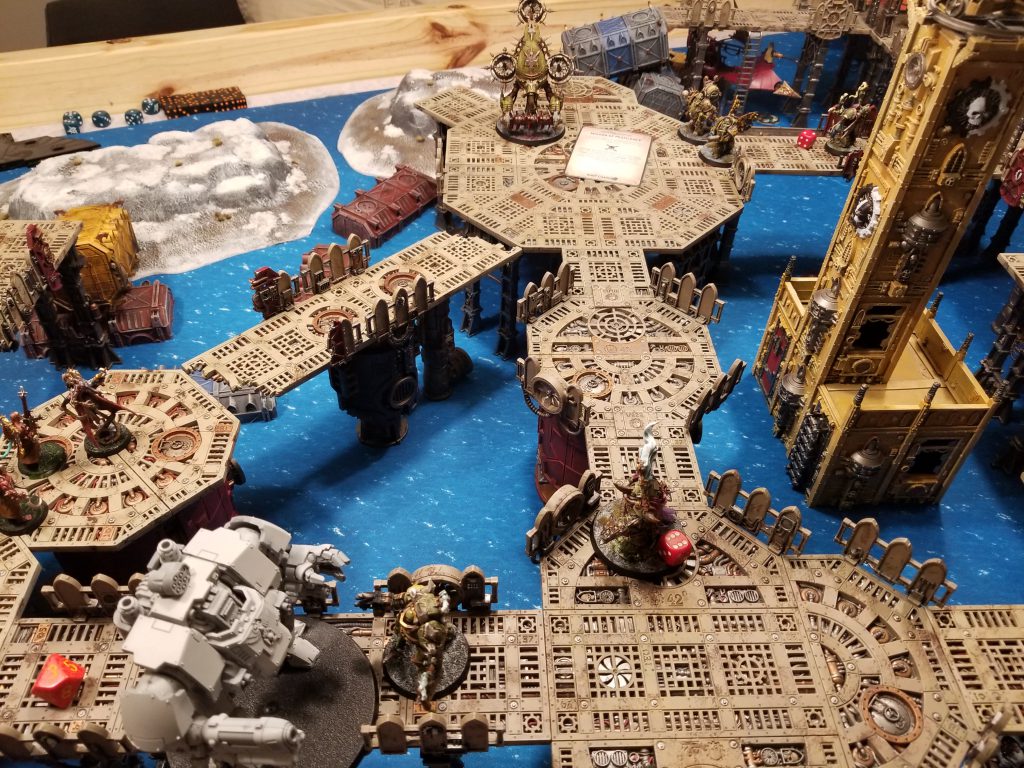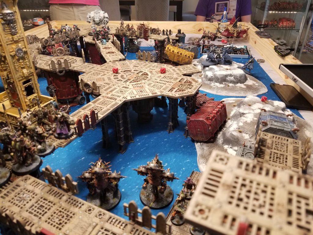 I ended up deploying along the left side of the table (as considered in the diagrams above) and deployed mostly in the upper left on the taller structure, though I put a unit of poxwalkers on the lower dock near the islands. I also put Loimos and his retinue of Blightlords into a teleportarium - this kind of battlefield can be slow to traverse even when advancing and I was comfortable with the idea that I'd find room to deploy. For agendas I took Honour the Patron, Reaper, and Priority Target. I don't remember all the opposing agendas but I do remember that Condit was taking credit for all of SD47's Space Wolves' kills.