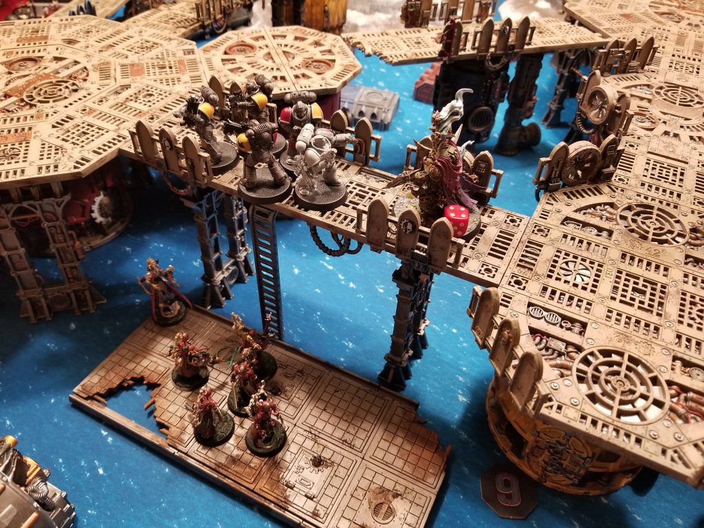 When it came to playing on the terrain, we settled on a few guidelines. The first was that each discrete section of the board counted as an area terrain feature for the purposes of making ranged attacks, and would give light cover accordingly - so if you shot frmo a walkway to the next platform, the target would get light cover. The second was that shooting across any struts, platform supports, or guard rails/shields would incur a -1 penalty to hit rolls. These two rules ensured cover would still be a real effect in the game. Otherwise it was all Scalable.