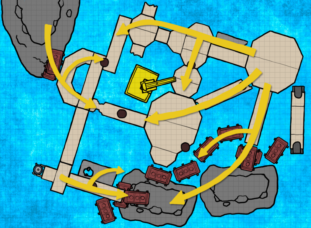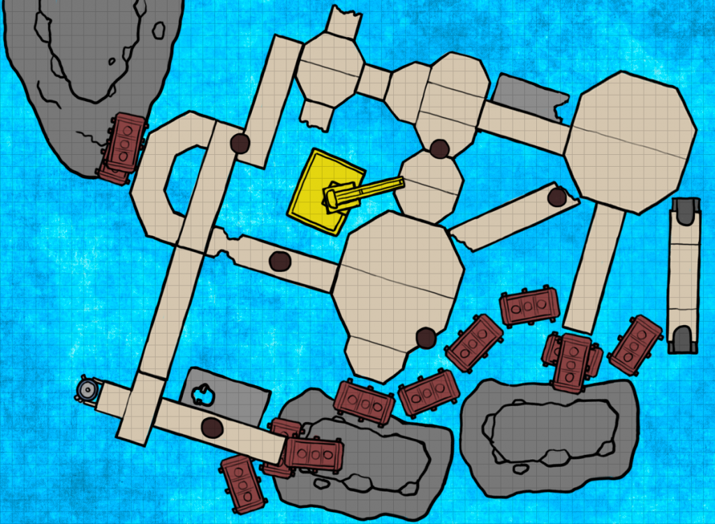 It's a pretty large space overall, and I've added some islands around the edges to help supplement the platform space. I also spent some time cutting crates in half to create a "submerged" effect which also made it easy to create a slight "bridge" of them across the table. That's key here - any time you build a table like this you're absolutely constraining the way models can move across it and you don't want to screw over everyone who doesn't have the FLY keyword. So one way to mitigate this is to ensure that you build in multiple ways to travers the battlefield. In this case that meant multiple walkways and a bridge of floating crates. All said and done, the walkable paths across the table looked like this: