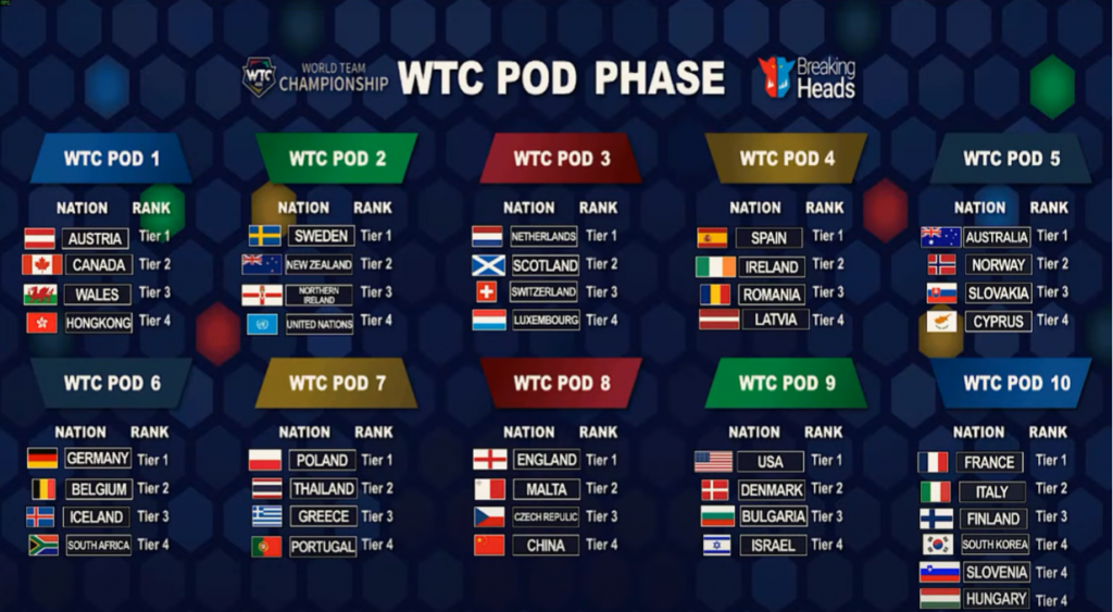 At the start of the event, teams are split into pods, each ideally containing four teams, though in some cases (like this year) a pod may have six teams if the number of teams isn't divisible by four. Teams are seeded 1-4 (given a tier ranking) based on their performance in prior events and teams from each tier are placed into each pod. In the first three rounds of the event, teams play the other three teams in their pods. Starting in round four, Swiss pairings are used and this is often the most important round of the event as it'll see two of the top-scoring teams face off. This year, that was when Team USA played Team France.