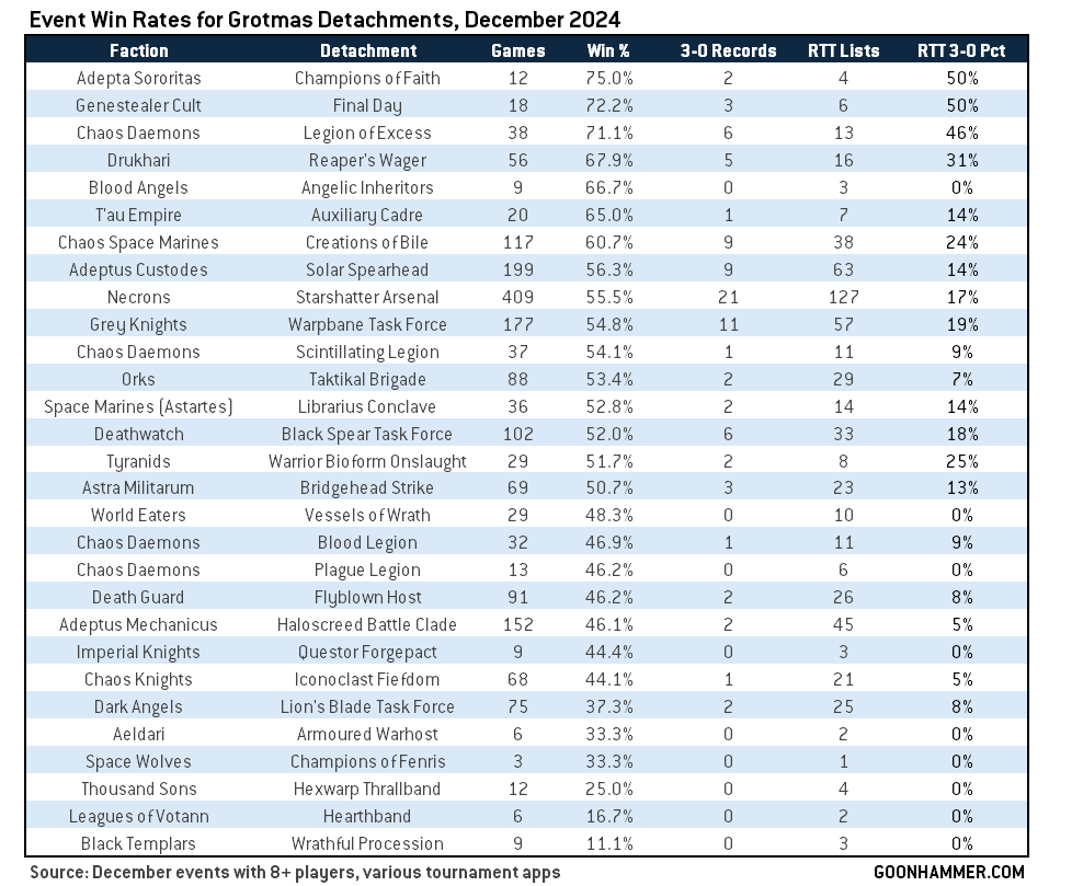 It's worth noting that a handful of these have shown up at the sparse GTs run in the middle of the month, two weeks after the first week of Grotmas releases but before events stopped. Among those first GTs, only Creations of Bile and Warrior Bioform Onslaught lists posted results. And we still don't have anywhere close to enough data on some of these, even with the RTT spread - Champions of Faith and Final Day look like they could have legs but I'm wary of any result with fewer than 50 attached games. Likewise, people haven't played Champions of Fenris, Wrathful Procession, Armoured Warhost, Angelic Inheritors, or Hearthband much at all, which makes sense as they're by far the newest in the sample (except for Armoured Warhost, anyways).