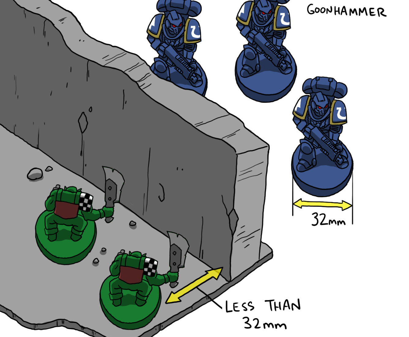 The solution then is to not leave them any space to do so. And the way you do that is by making sure that the distance between your models' bases and the other side of the wall is just over 1", such that a 25mm or larger base cannot fit between the wall and your units. This will prevent a unit from being in Engagement Range while touching the other side of the wall, but unable to physically fit between your models and the wall. The thicker the wall is, the easier this is, and the larger the enemy's base. So this is super easy if your opponent is trying to bring in Terminators on 40mm bases, and much more difficult if your opponent has itty bitty Harlequins on 25mm bases, where if the wall is thin enough you might not be able to screen them out!