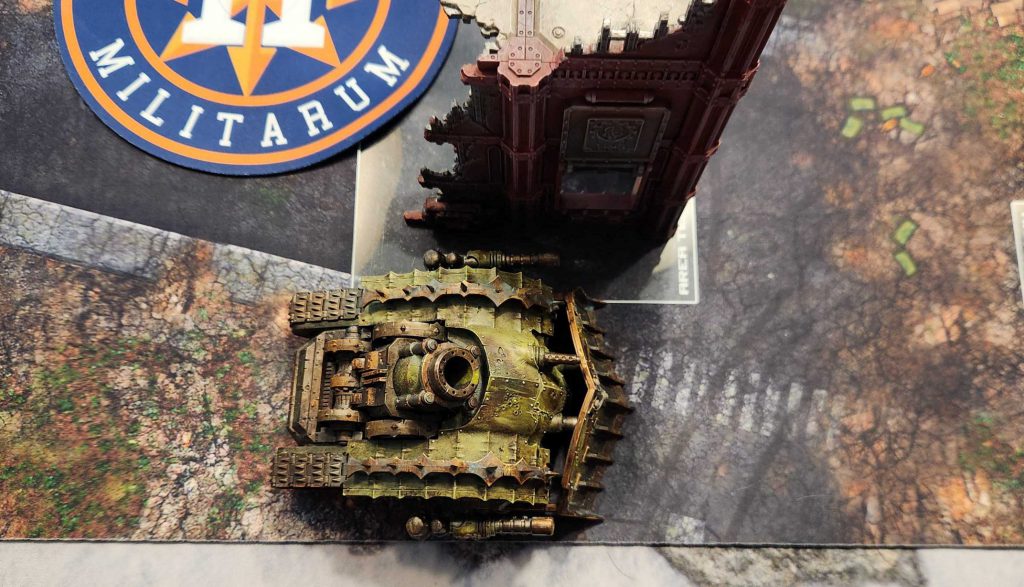 For the most part, events tend to define this space as being 4.5" to 5" wide, which is large enough for most vehicles - including the Plagueburst Crawler there - to pass through, even if that's not physically how things are set up on the table. You'll want to be aware of this going in - whether you can move through that gap makes a huge difference in your game plan.