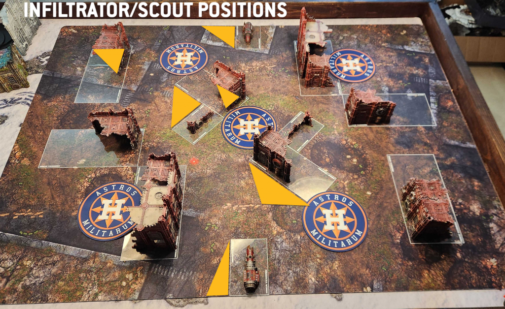 Where you can place infiltrators/scouts will depend on deployment map - you have to stay 9" out of your opponent's deployment zone - but generally speaking you have a few options here. That crook inside the smaller L ruins (