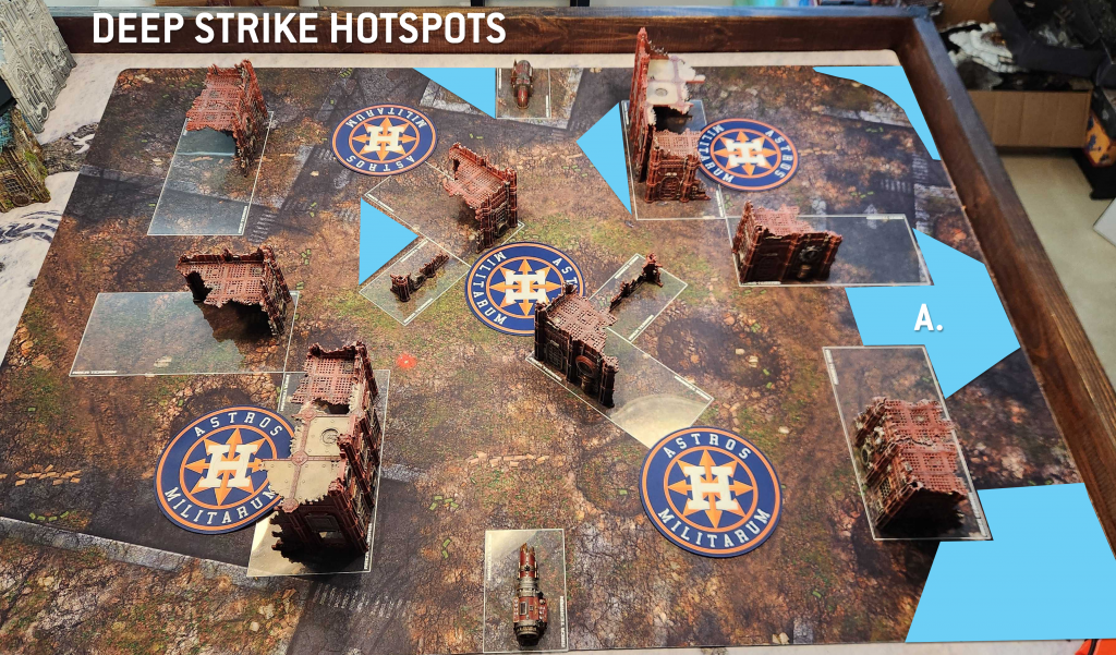 A" up there is also a great spot for deep strikers who want to charge in, as it lets you typically drop outside the ruin (and out of line of sight of units