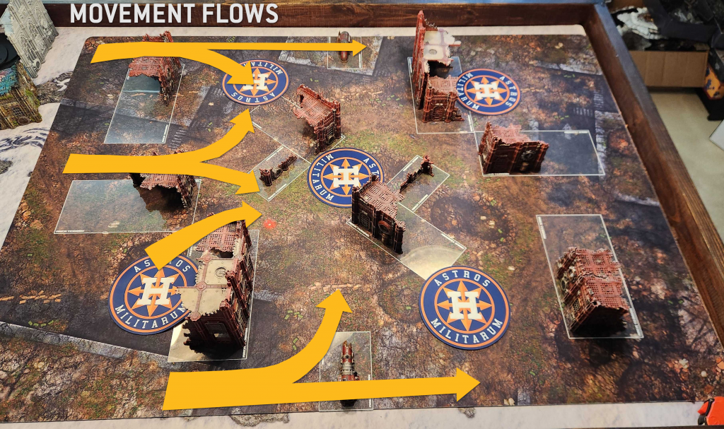 While infantry can generally move however they want through the ruins on this map, the terrain is naturally going to flow models - particularly vehicles - to one of three lanes. The most common area for staging here is inside the crook of the small L-shaped ruins (