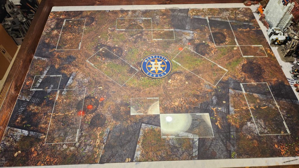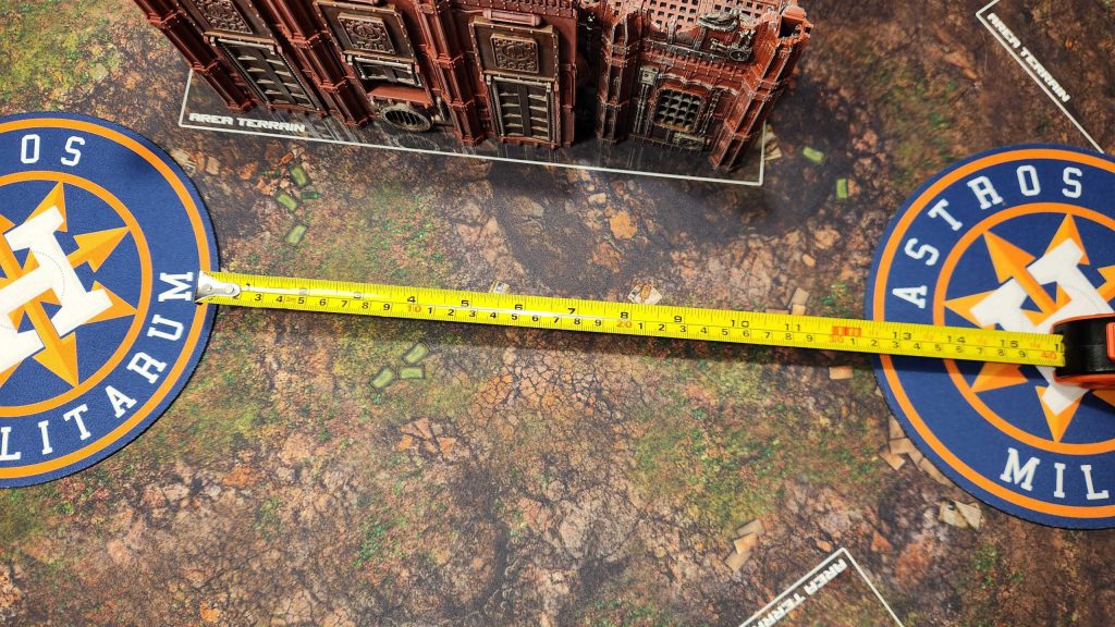 - The diagonal sightline across the middle of the table runs longer here than it does on layout 1, and you really need 48" range to shoot the entire line. That said, 36" plus some movement will usually get you there.