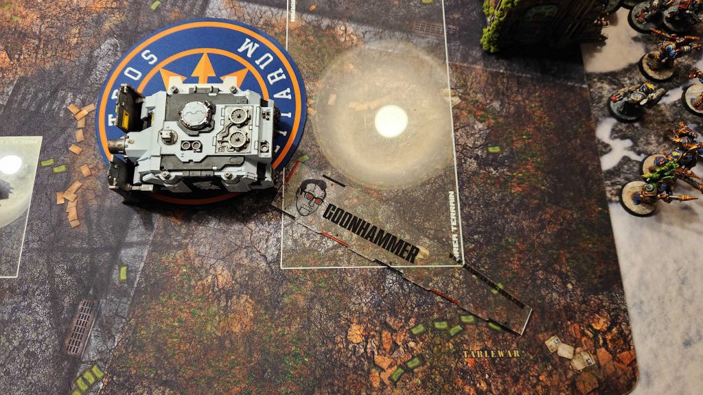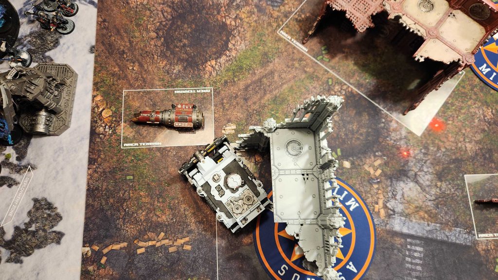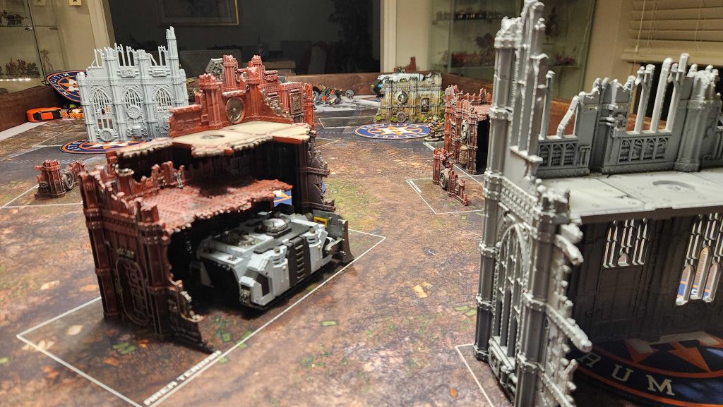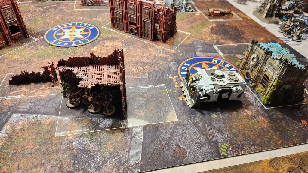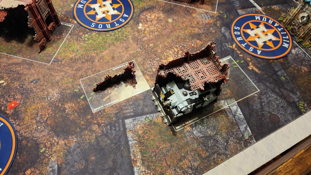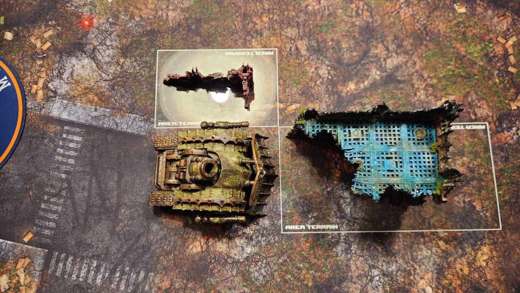 Sitting behind the C ruin with a vehicle at the start of the game is pretty common on Crucible and Tipping Point layouts, and because that area terrain is 6" wide, vehicles can typically move across it pretty easily, or at least get wholly within it to be able to shoot out effectively.