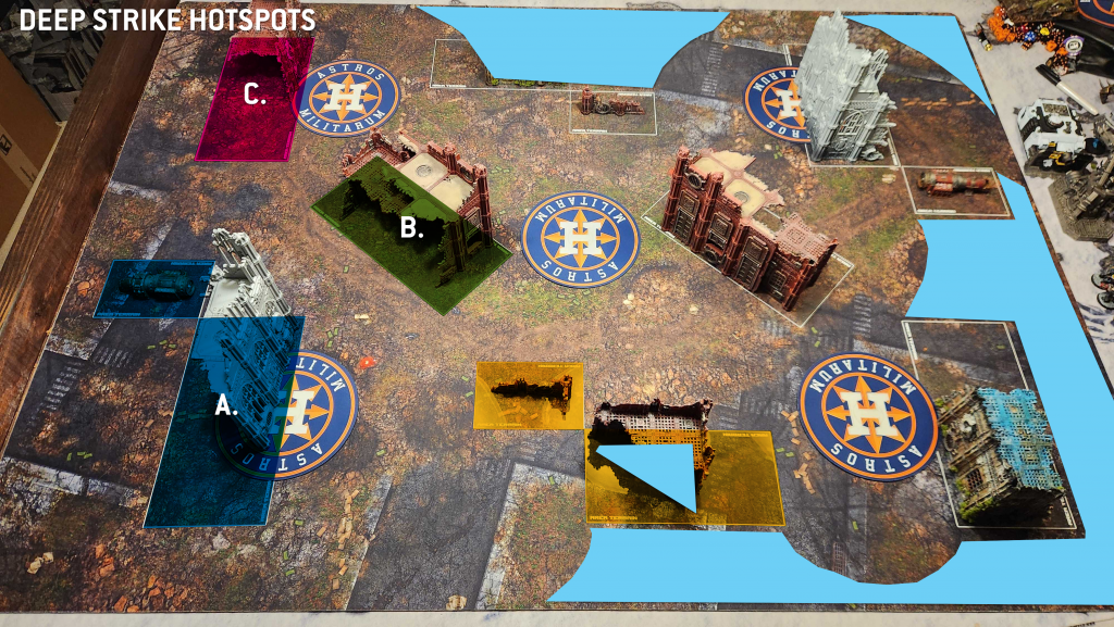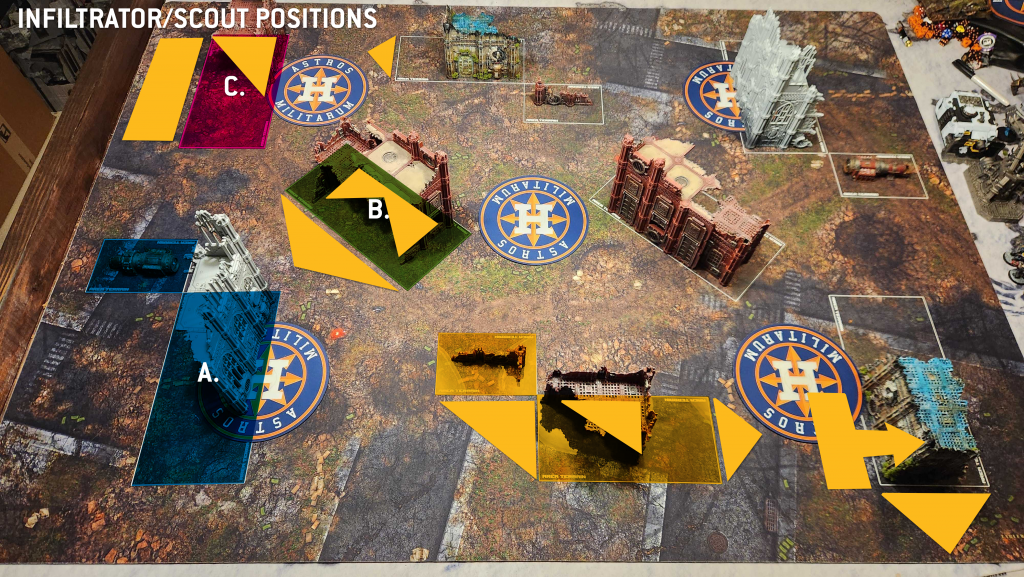 As always, where you can place your Infiltrators or Scouts will depend on the deployment map - you have to stay 9" out of your opponent's deployment zone - but generally speaking there are a few common moves. The two crooks on the D Terrain piece are both common and generally safe spots on Tipping Point/Crucible, while on Search & Destroy you'll likely be looking at dropping in or behind one of the C ruins.