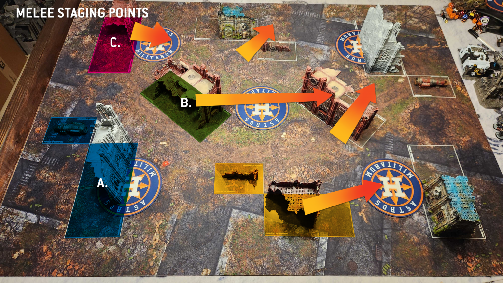 Charging from behind the wall of the midtable D ruins is trivial on Crucible/Tipping Point, and will typically require something like a 9" charge on Search & Destroy. Meanwhile, coming in from behind the wall on the C ruin is pretty easy - if you're charging a unit on the objective from the D ruin, make sure there's no unit in C that can charge in with Heroic Intervention and cause problems.