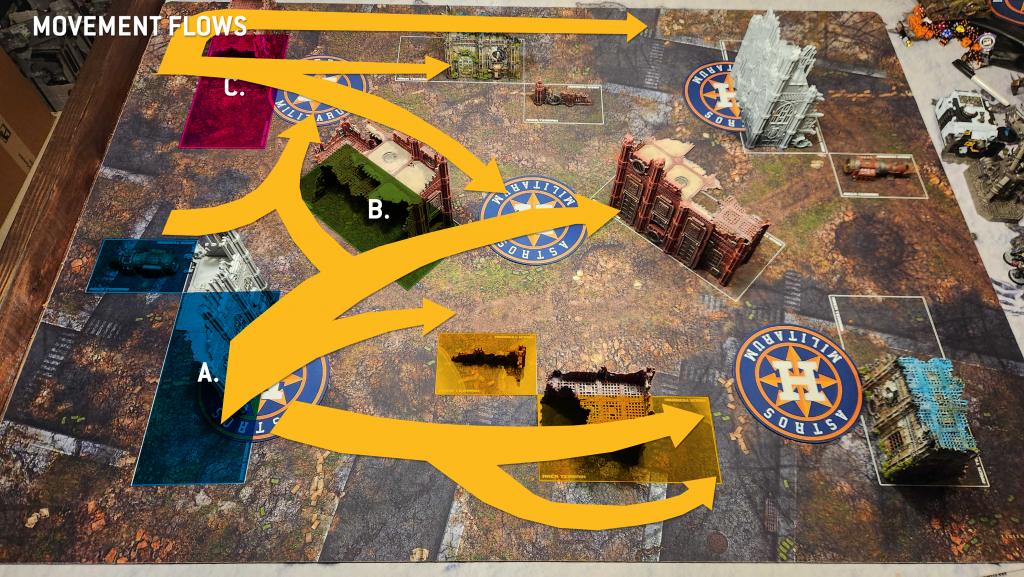 Being more open, this table tends to offer a lot of options when it comes to movement. Tanks will typically have to pick one of four movement lanes - moving along either long table edge or between one of the two gaps around the B ruin. For infantry the plan will often be to move into and through the middle B ruin and through the opposite one. This terrain ends up being a lot less restrictive for vehicles than it looks, in part because they can easily just move over those 4"x6" ruins in the A and D ruins, meaning they can get out of those protected areas much easier if they need and change their plans.