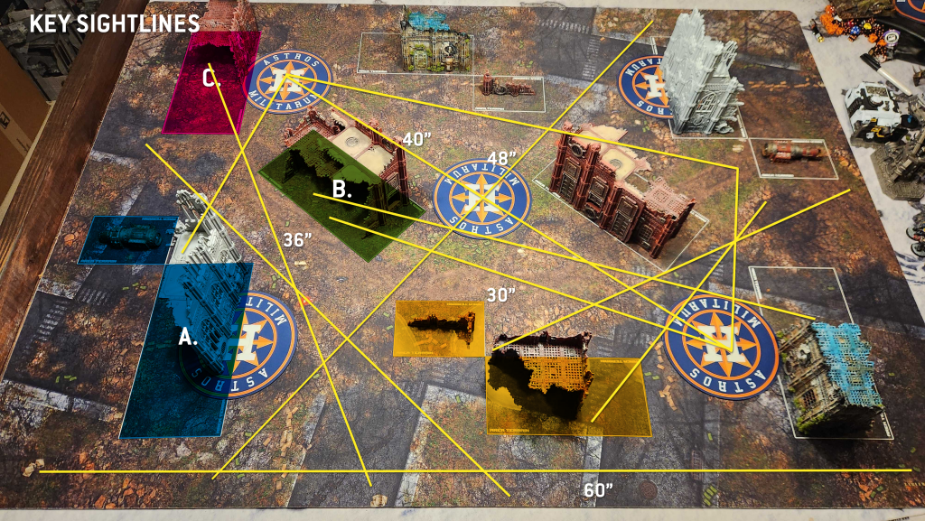 - The long sightline down the long edge of each table. This runs 60" effectively, making it one of the few times in tenth edition 40k where having a weapon range over 36" actually matters. If you want to shoot from the A ruin to the C ruin you'll need to have just over 36" of range - that's how far it is from the edge of one to the other.