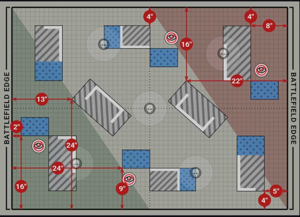 - The other diagonal, going across the three objective markers, is about 40" long on Search & Destroy and something more like 36" on Crucible of Battle and Tipping Point.