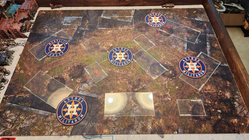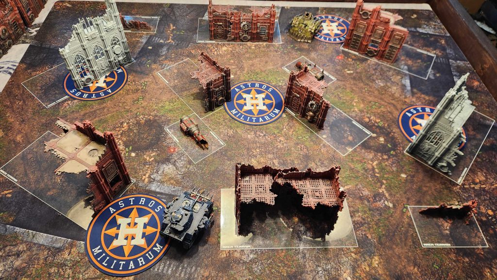 Playing on Layout 3 in Sweeping Engagement at the GW US Open Tacoma event in 2025. Note the larger U ruins, and U-shaped ruins on the A bases, plus the heaveir overlap on the middle ruins - terrain can vary by table, even at official events!
