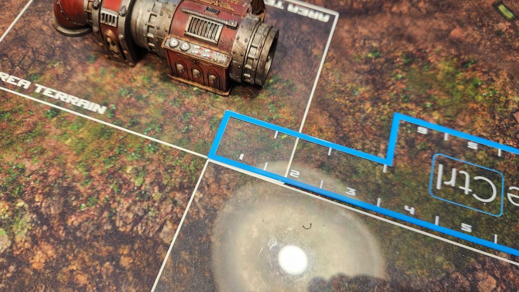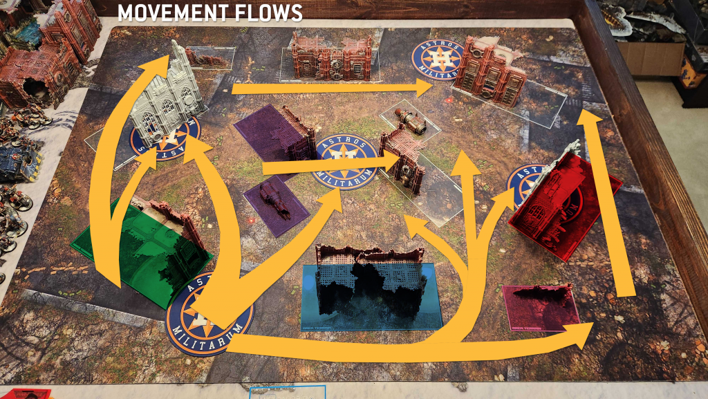 For vehicles there's really nowhere you can't go on this map; it's among the most open maps in the Tournament Companion and one of the few that can easily accommodate the likes of a Defiler or Soul Grinder. The terrain and positioning of the bases give you wide movement gaps between ruins and the places you'd most likely struggle tend to use 2" ruins.
