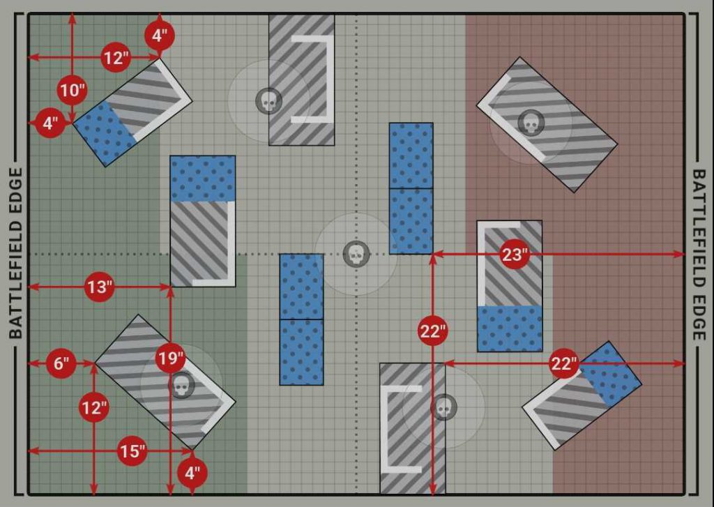 Melee units have a much better time on Layout 8 than any other layout, and the pair of tilted corner ruins makes it good for deep strikers as well. Because of how this map is set up, movement flows tend to just be the same as what you'd see on Layout 7, moving horizontally across the table or turning in diagonally to hit the middle. Because the middle is pretty exposed on this map, more skirmishes tend to happen around the two side objectives as players attempt to hold their own while capturing the opponent's objective.