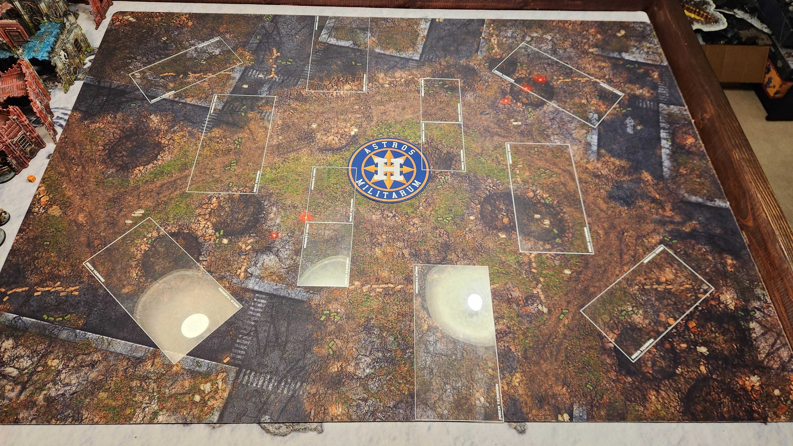 Note the large differences in how each table plays based on the terrain used - the gaps along the wall on the U-shaped ruins are smaller on the Ork terrain layout, and the wall there itself much longer. The scatter terrain on the middle ruins changes significantly how models move through/onto them, and the L-shaped ruins on the small corner ruins are facing the wrong direction, making it harder to safely hold those objectives. These guides are here to help you understand the layouts, but be sure to actually look at the table before your game to ensure that you're playing around the ground truth.