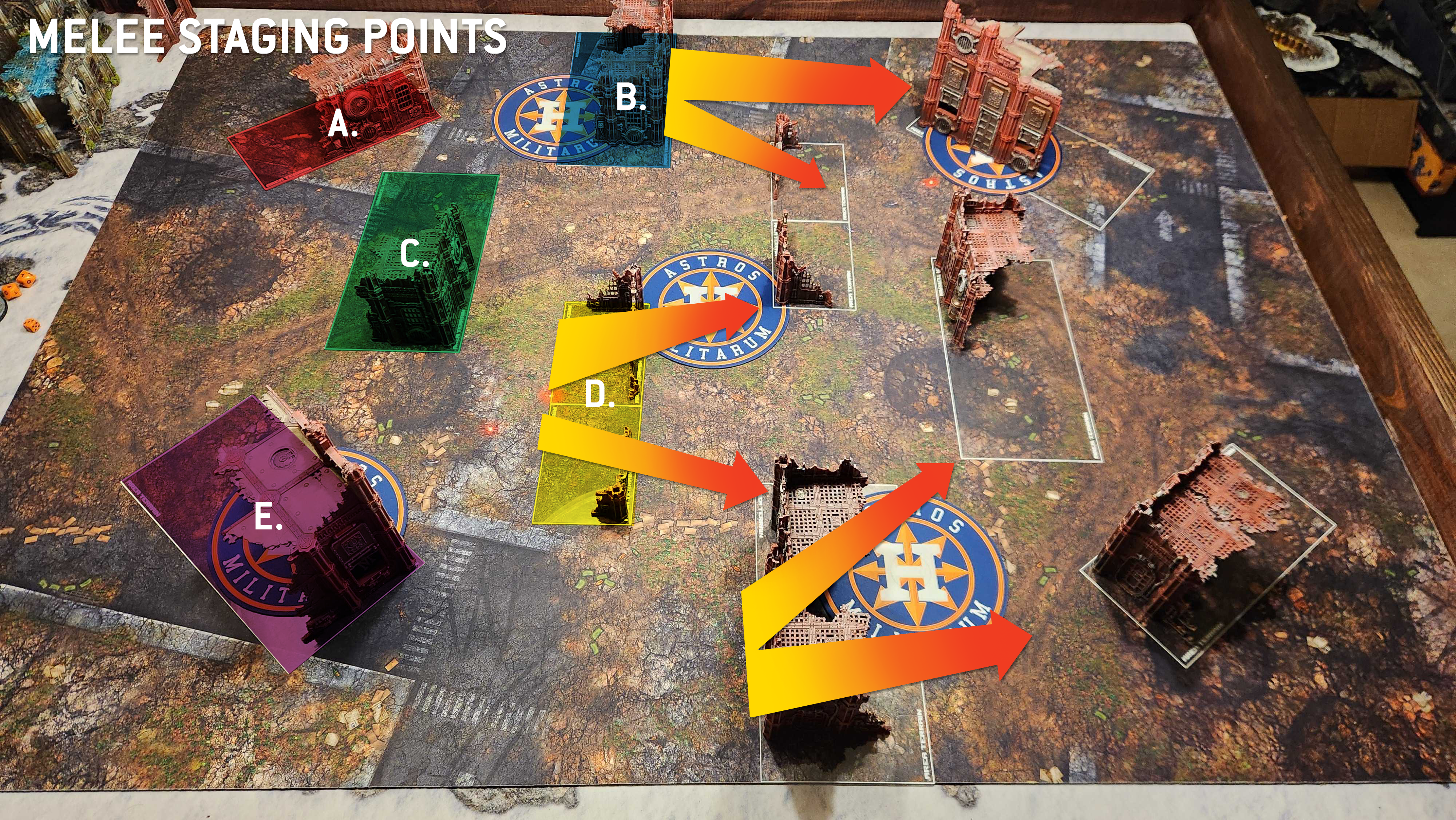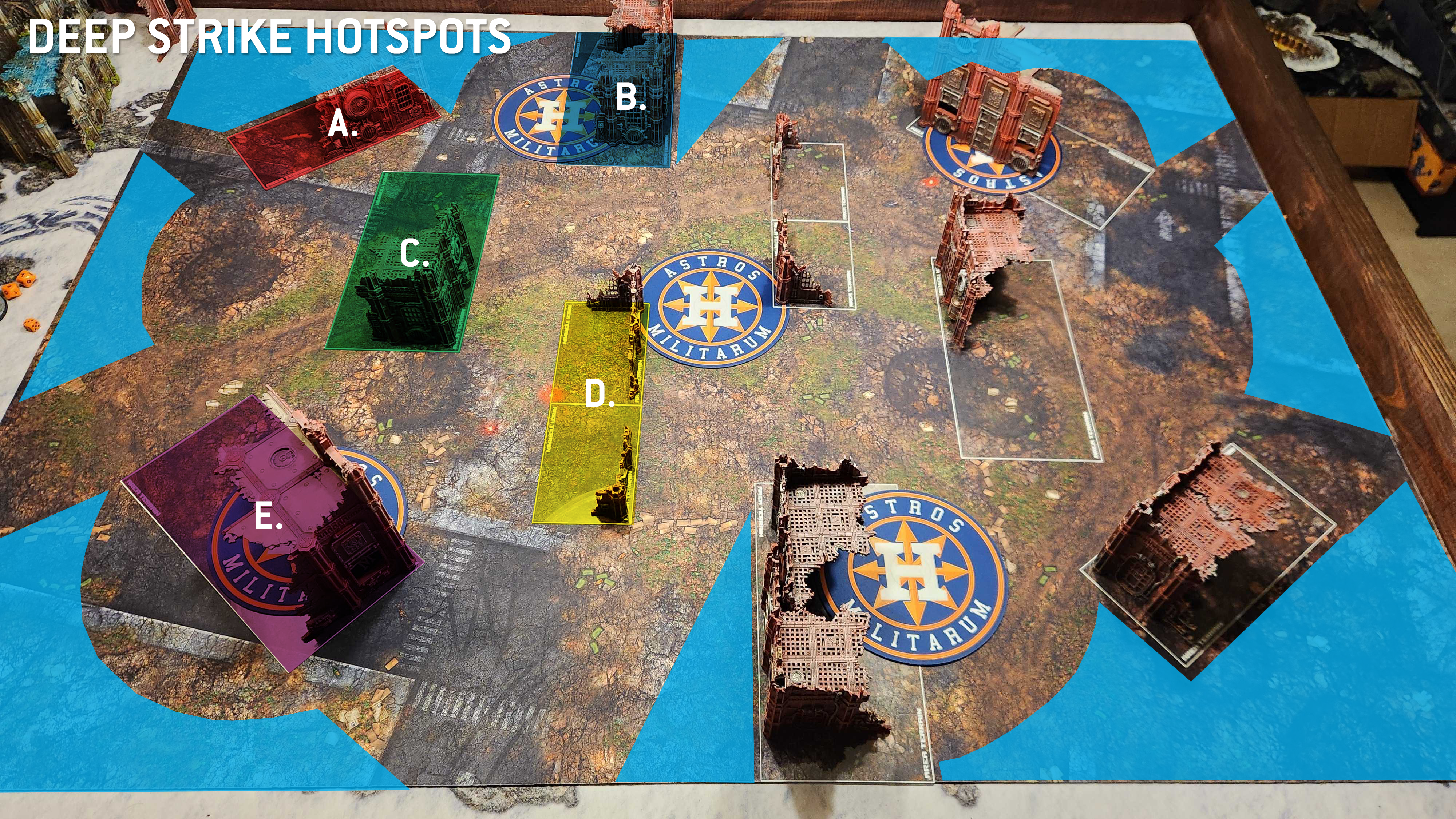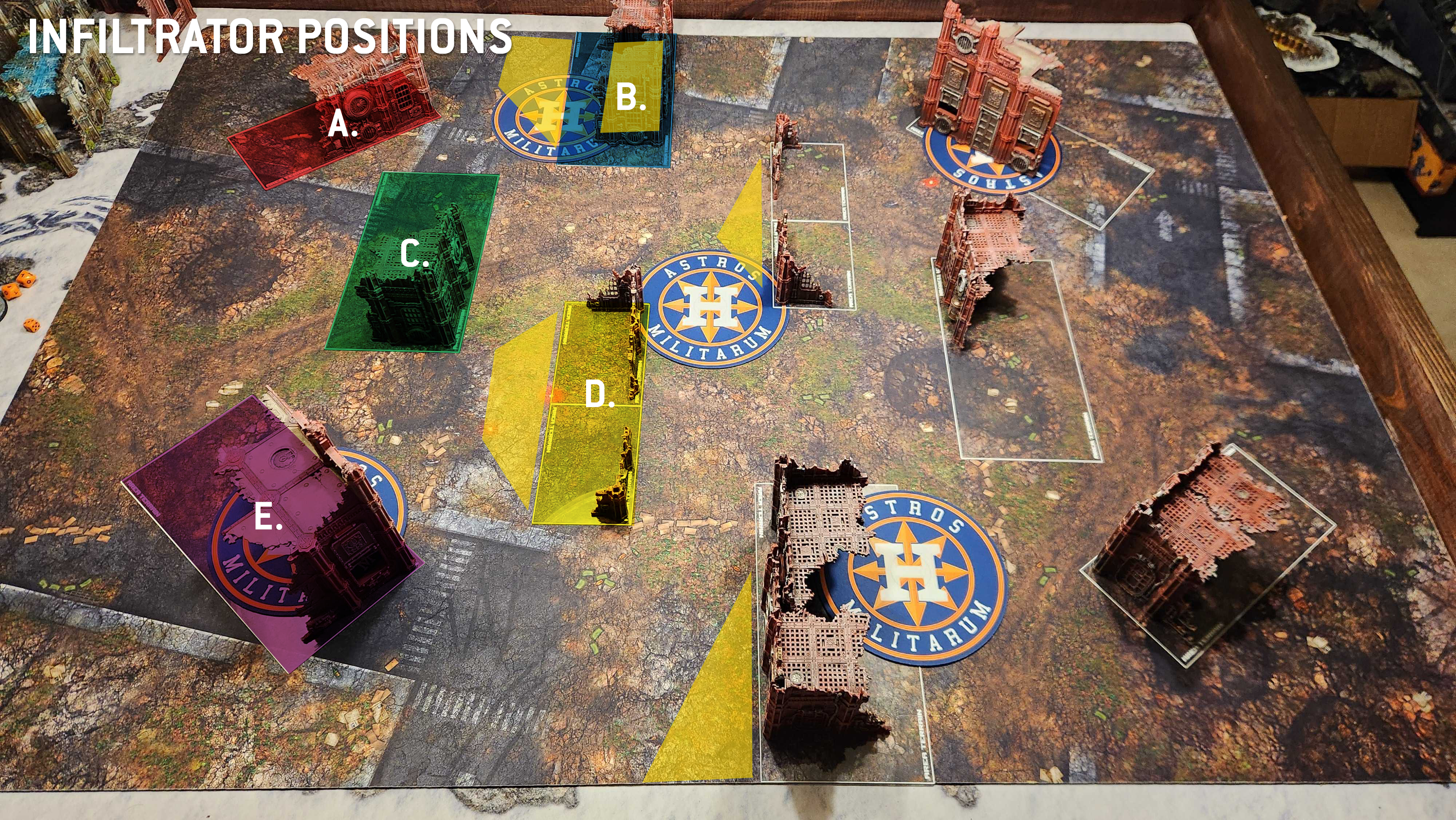 Infiltrators tend to want to set up in the B ruin, where they can be safe behind a wall and touching an objective. Particularly aggressive units or those with Scout and Infiltrate may deploy in or around the D ruin or the opponent's B, with a plan to Scout backward if need be. Because those D ruins are only 4" across, it's easy to deploy on the safe side of them and just walk to the middle to score something like Establish Locus or Area Denial.