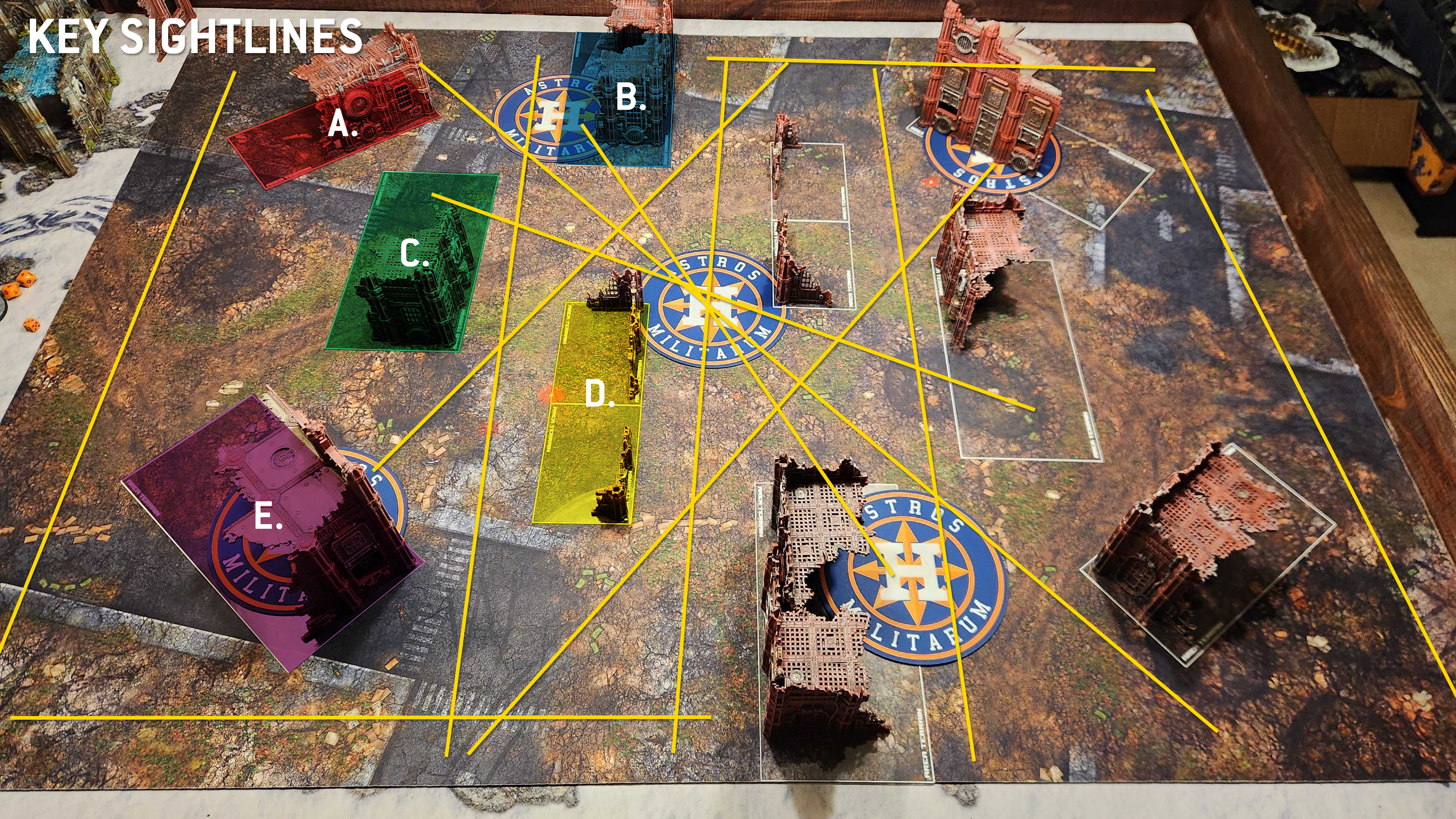C. The middle 12x6" ruin. This ruin acts as a shield during deployment, and the ruin on it should be big enough to hide a unit of infantry or a small tank. Sitting in this ruin can give you a good view past the B. ruin while still being protected from the line of sight on your enemy's B. ruin.