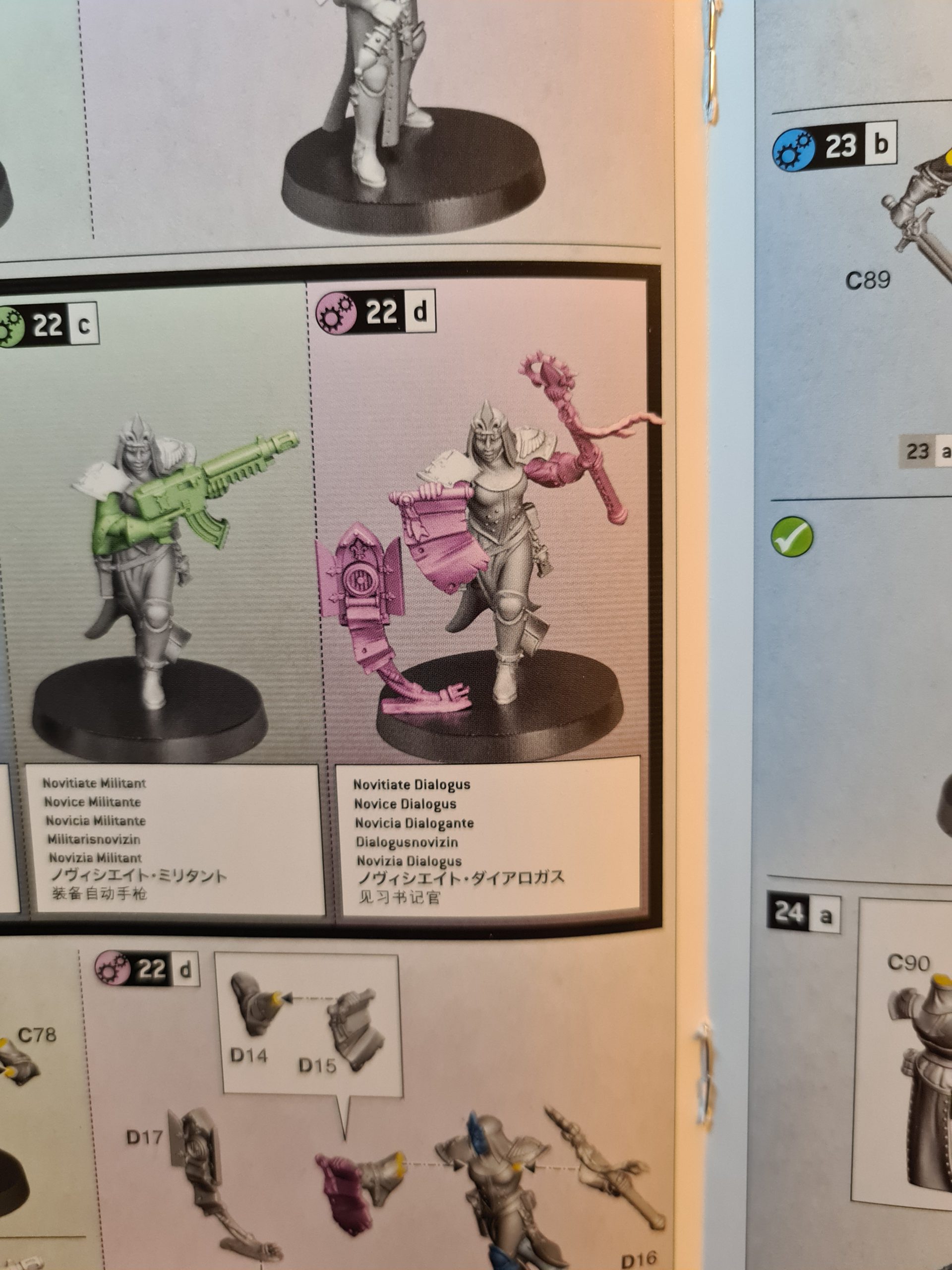 The new Novitiates are on 28mm bases, like the Neophytes from the Black Templar box, and their sisters in the Repentia. There seems to be a clear theme emerging here, with 28mm being the base size for units/models in power armour armies that are not themselves power-armoured - with power armour being on 32mm or bigger, as is the Novitiate Superior here. We've otherwise only seen these for Howling Banshees and Incubi, which suggests a similar kind of thing - those