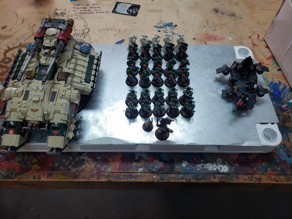 I’m never not doing a bit when it comes to lists. My normal tournament list is actually the tan Astraeus with 30 Hellblasters, titled “And Hell Followed With Him” because with the hat the Astraeus is the Pale Rider. Fun fact, that list has actually gone 2-2-1 at a GT (with the draw being against my teammate Jason Merten, who was in the top 16 this weekend) so I continue to hold onto the belief that it has legs.