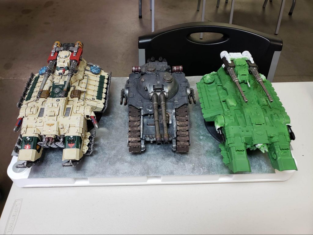 The green Astraeus is actually owned by my brother, who’s painting it for his Salamanders, hence the green armor, and he graciously lets me borrow it if I want to do some wacky bullshit, such as my previous 3 big tanks list.