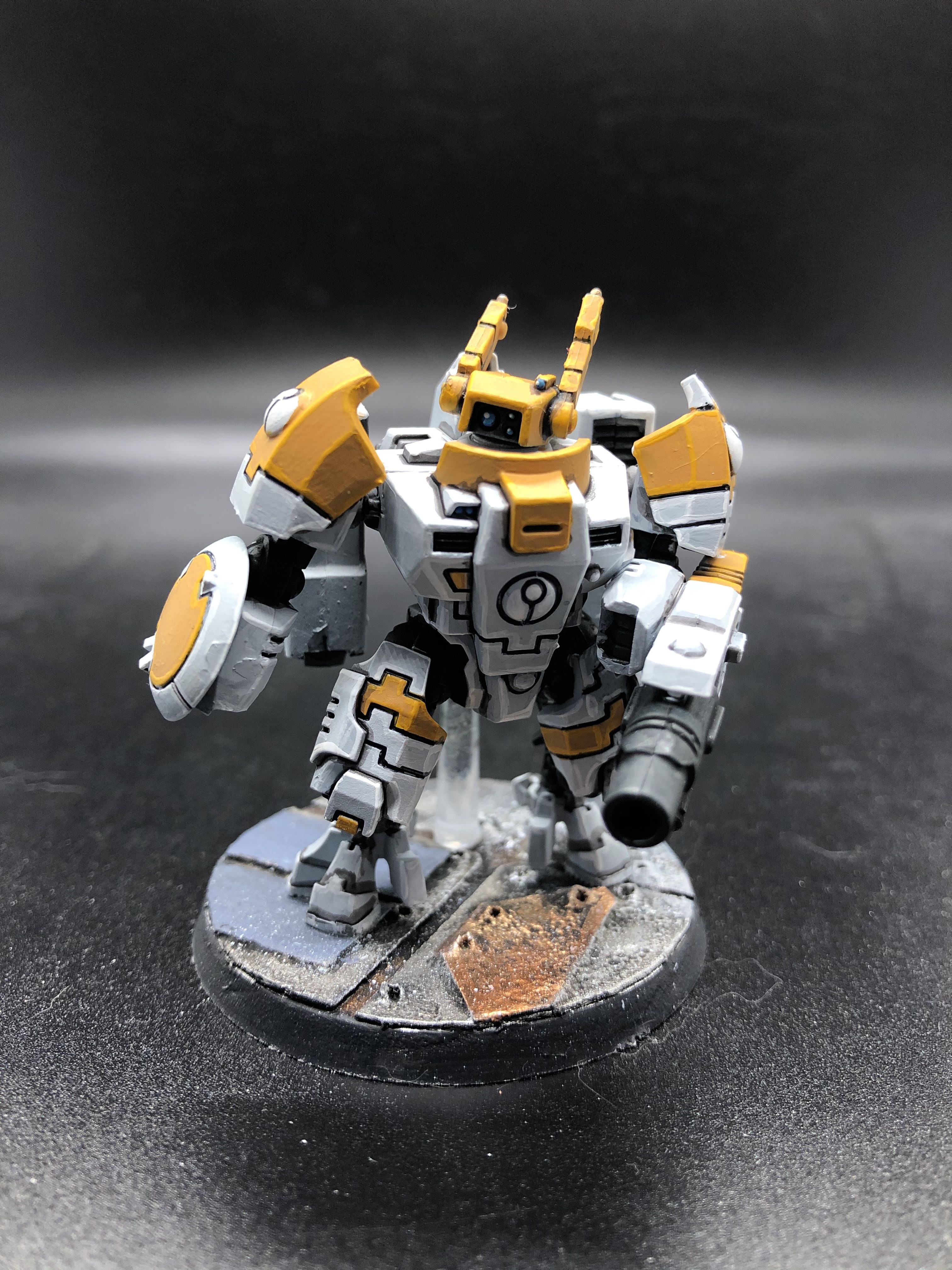 HQ: Commander in XV85 Enforcer Battlesuit [8 PL, 179pts]: Advanced targeting system, 3x Cyclic ion blaster, Talisman of Arthas Moloch. 2x MV4 Shield Drone: 2x Shield generator