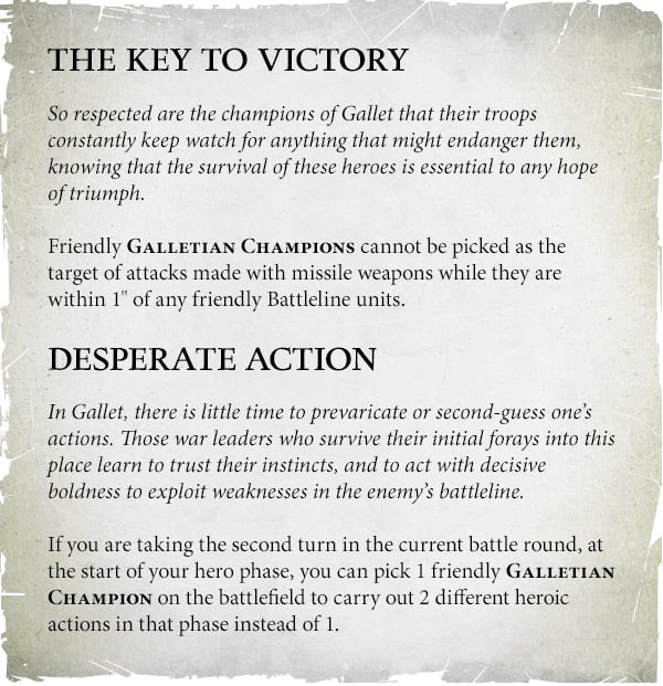 Fueled by Ghurish Rage - Once per game when the Galletian Champion die, they can survive on 3+ and gain D3 wounds back. A dicey choice but useful if your army is lacking for Galletian Champions and keeping the one you do have alive is too important.