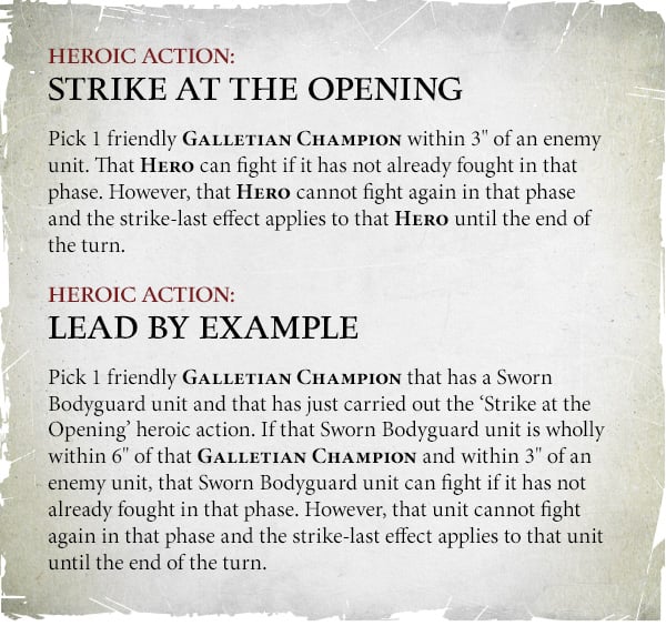 A Matter of Honour - Pick an enemy Galletian Champion or Bodyguard and destroy them with one of your own Champion or Bodyguard. Very similar to Head to Head from last season, for many armies this is reasonable and a matter of course for playing Age of Sigmar.
