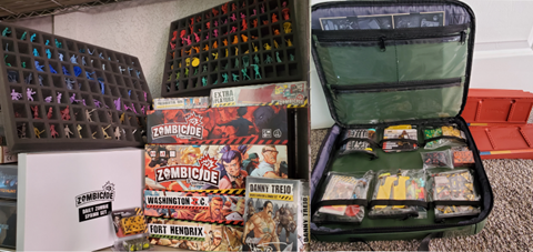 everything for the First Edition of Zombicide. As the years have gone by, we've added Prison Outbreak, Angry Neighbors, all the extra Survivor characters (except two promo Survivors from the very first Kickstarter, but that's another story), Ultimate Survivors, dice towers, Zombivors, barricades, Zombie Dogz, Zombie Crowz and more. And that's just First Edition! Second Edition—which I ran—isn't as expansive at this point, but it can use any of the 100+ First Edition Survivors and zombie types. I had a lot to consider.
