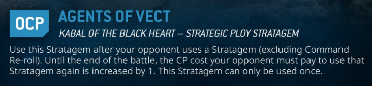 When you do choose a Stratagem for Agents of Vect, your ideal targets - besides things that will be used again - are stratagems with a high upside that will force your opponent to play differently. You’re not necessarily going to stop an opponent from using them at all unless they’re strapped for CP, but you can force them to play more cautiously or adjust their strategies if they can non longer afford to blow 3-4 CP on a combo. In that sense, it can be very tough to get positive feedback for a successful Vect - it’s difficult to watch for what someone isn’t playing thanks to your use of the Stratagem. So you have to be mindful of what an opponent could do and what you’ve prevented them from doing by choking off some of their CP.