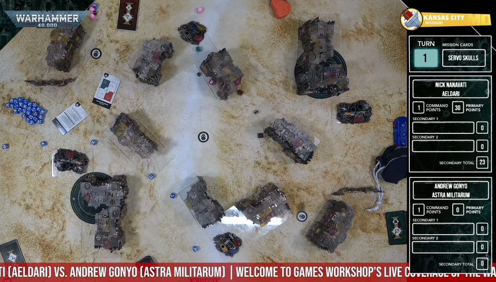 Andrew Gonyo and Nick Nanavati played another stream game of tenth edition the next night, playing Astra Militarum and Aeldari respectively, and there's a few more things to glean about tenth while watching. First, we got a little bit of a better look at the table layout used for these stream games. It’s still a work in progress according to the commentators, but these layouts will probably end up being the tenth edition GW layouts.