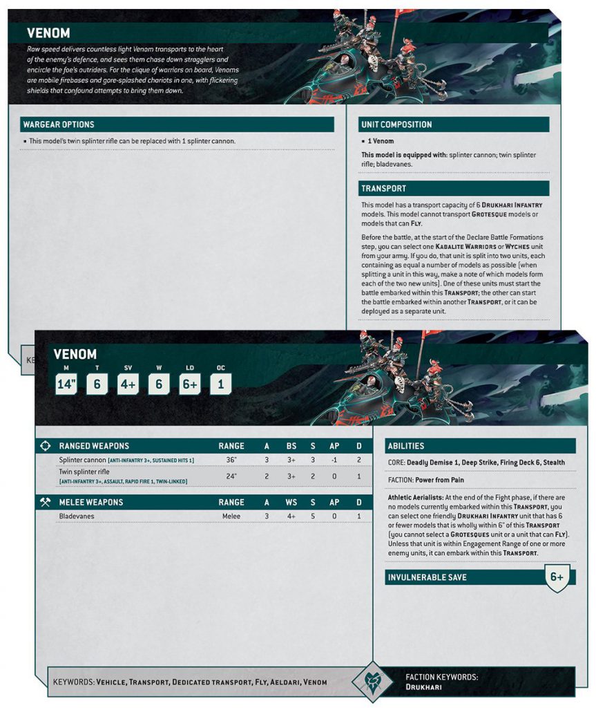 Onto the datasheets, we take a look at the Venom first. For the discerning Drukhari eye, there’s quite a few changes to note here.