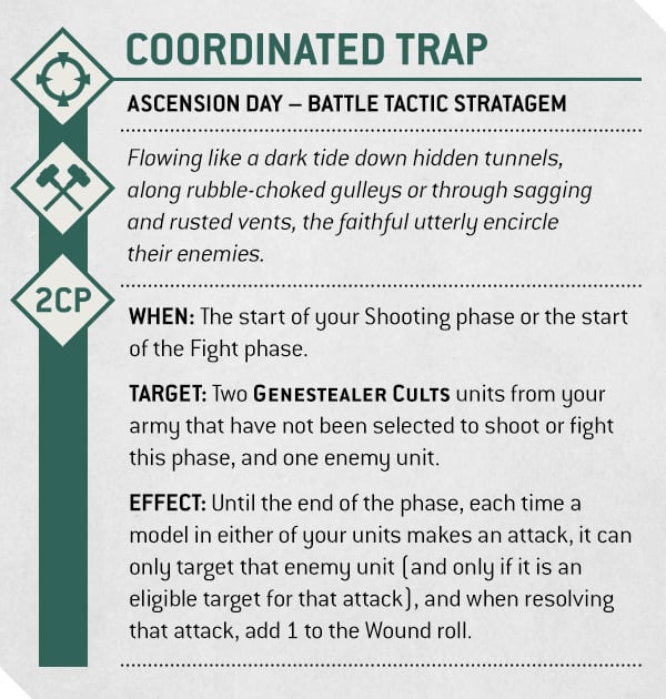 They Came From Below. It’s really simple and gives Sustained Hits 1 and Ignores Cover to weapons equipped by models from when they are set up as reinforcements to the end of your next fight phase. Considering all GSC infantry can deep strike anyway, and Cult Ambush now exists, this is a really fun little bonus to have.