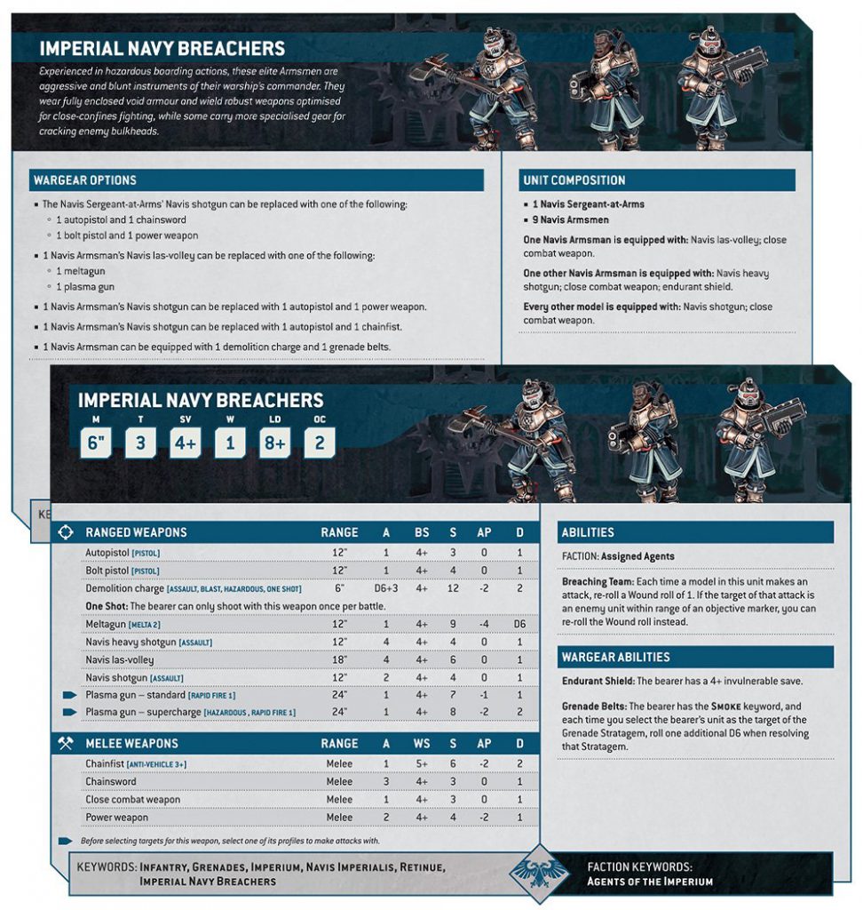 Breachers are pretty similar, though their ability is a pretty nice change, especially in combination with the buffed demolition charge. The shield also goes from a 5+ Invulnerable save to a 4+. All in all, they’re some pretty nice changes, and they seem like a pretty versatile infantry squad.