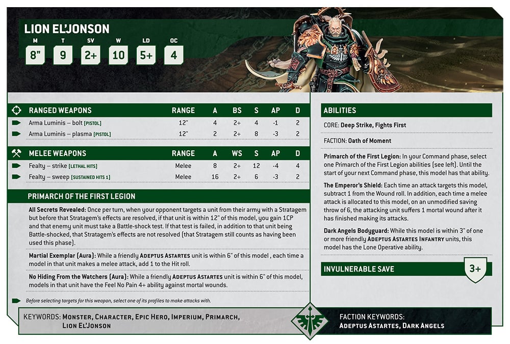 It’s the Lion! The most obvious changes are way more toughness (6 to 9!), an extra wound and a 3+ Invulnerable Save! The Arma Luminis has had its attacks doubled, and while Fealty does slightly less, it now has Lethal and Sustained hits, making it even more clear when you should use which profile.